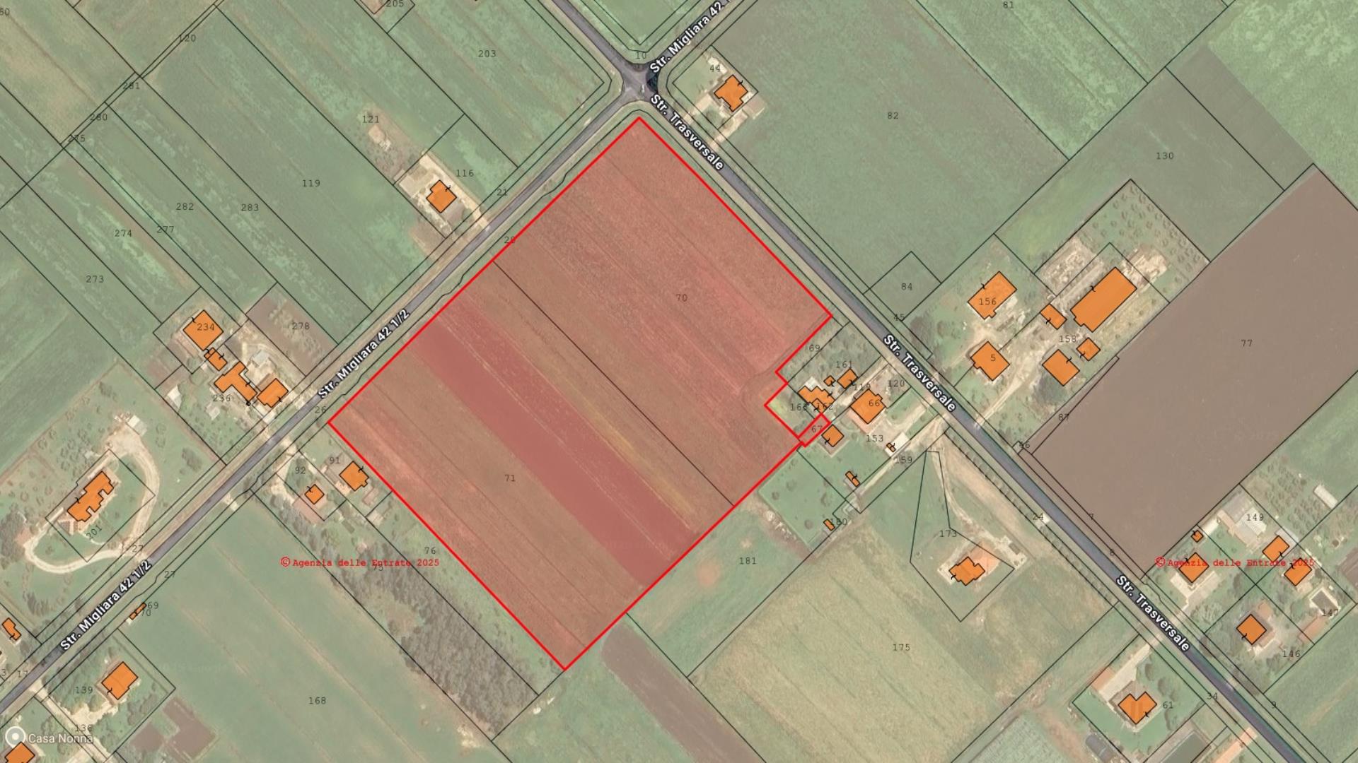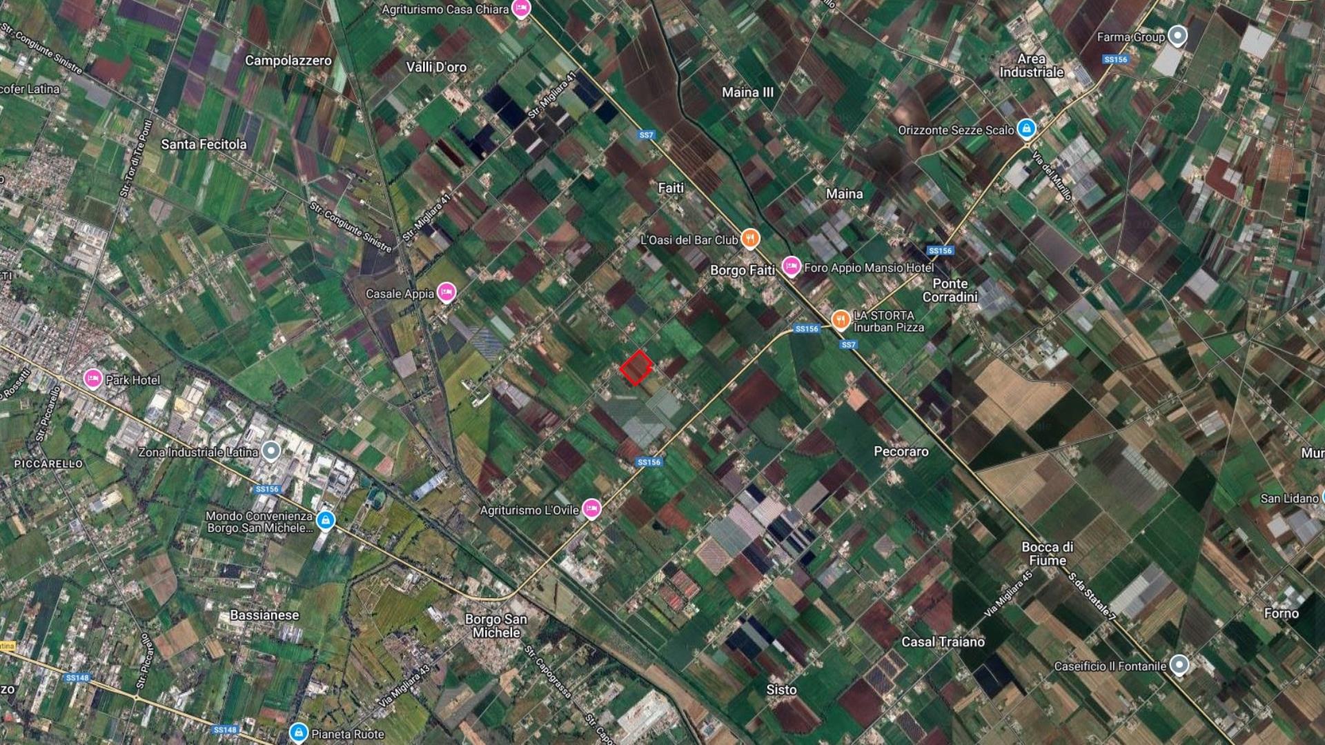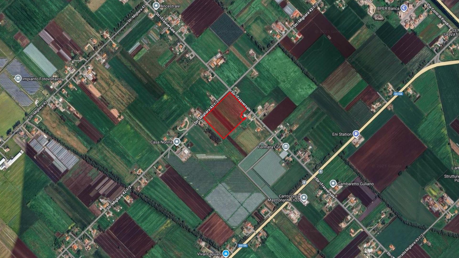 Si propone in vendita un terreno agricolo pianeggiante di circa 4 ettari, situato in località Borgo Faiti, in posizione angolare con doppio fronte su strada pubblica, sia su Via Traversale che su Via Migliara 42 e 1/2. La proprietà presenta una forma regolare, è facilmente accessibile e beneficia del servizio irriguo fornito dal Consorzio di Bonifica.