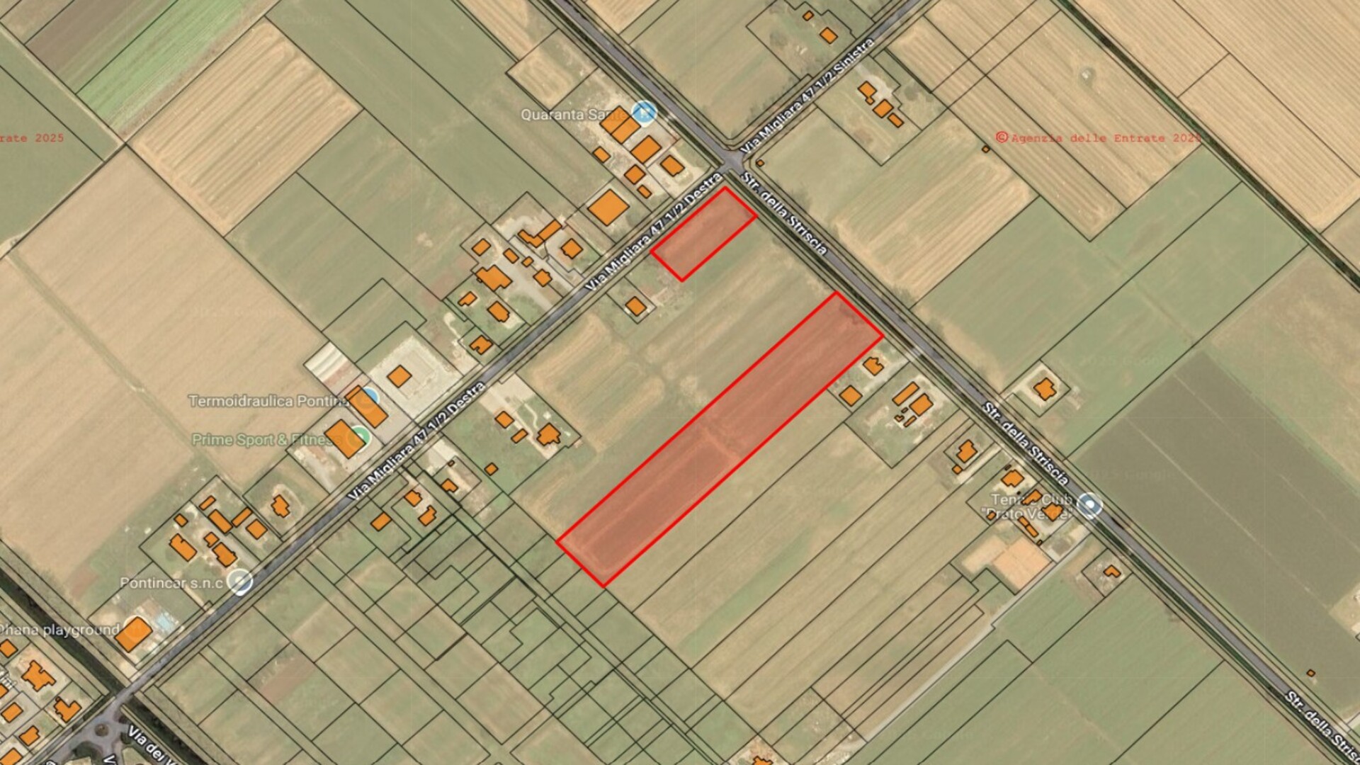 Terreno agricolo di quasi 2 ettari, situato a Pontinia lungo Strada della Striscia, con accesso da Via Migliara 47½ DX. La proprietà gode di fronte strada e servitù di passaggio regolare, caratteristiche che facilitano l’accesso e la gestione del fondo.